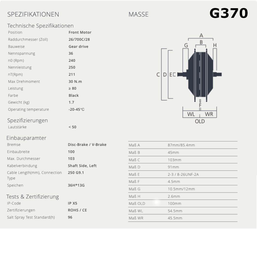 | 36V – 250W | Vorne/ Hinten | 25 km/h | 1:4,4 | 42 Nm | 230 RPM | 250 RPM |