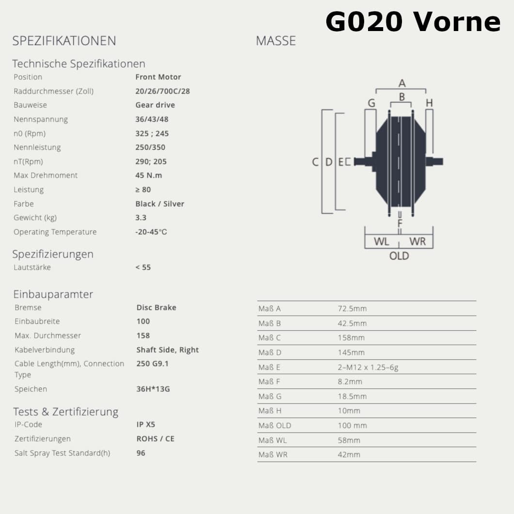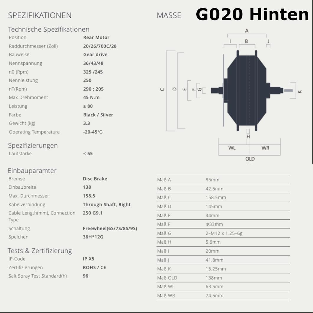 Von Bafang haben wir den G020, G370 und den G040 im Angebot. Im Folgenden finden Sie eine Tabelle mit den Hauptunterschieden. Falls es mehr als zwei Angaben gibt, bezieht sich die erste auf die 250W-Variante des Motors, und die andere auf 500W.