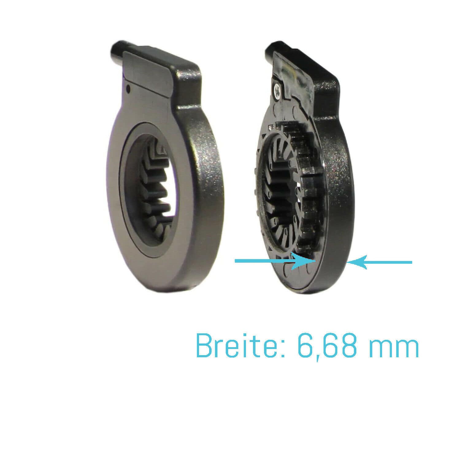 Der V12L ist ein Pedalsensor mit integrierter Magnetscheibe, besteht also nur aus einem Teil, anders als alle anderen Pedalsensoren von windmeile©. Diese ist mit 6 Magneten bestückt und sendet 12 Signale pro Umdrehung und ist somit etwas sensitiver als der BZ- 10. Er lässt sich nur auf der linken Seite des Tretlagers montieren und braucht bei einer Stärke von knapp 7mm vergleichsweise mehr Bauraum als der BZ-10.