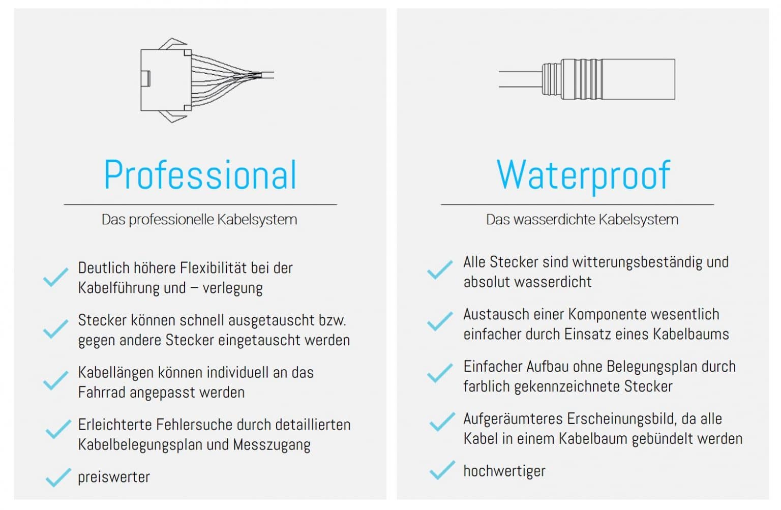 Bei unseren Produkten kann zwischen zwei verschiedene Steckersystemen gewählt werden, dem „Professional“ System und dem „Waterproof“ System. Das „Professional“ System ist für Profis mit handwerklichem Geschick, wobei das „Waterproof“ System auch für Anfänger mit weniger Erfahrung geeignet ist. Durch Versiegelung, Schrumpfschlauchen und dem Einsatz unserer Controller Box kann auch das „Professional“ System wasserdicht eingesetzt werden.