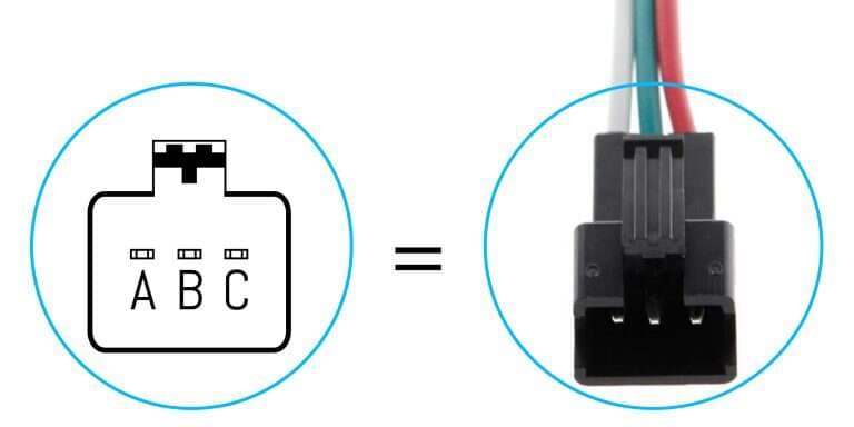 Unsere Pedalsensoren mit dem Steckersystem „Professional“ sind mit einem JST 3-Pin Stecker versehen. Die drei Pins (in nebenstehender Skizze mit „A“, „B“ und „C“ gekennzeichnet), des an dem Pedalsensor befindlichen Steckers, sind dabei folgendermaßen belegt: