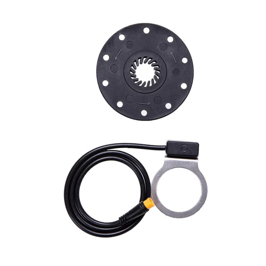 Der BZ-10B ist ein Pedalsensor und besteht aus zwei Teilen: der Magnetscheibe und dem Sensor. Die Magnetscheibe ist mit 10 Magneten bestückt und liefert 10 Signale pro Umdrehung. Der BZ-10 ist sehr schmal und lässt sich auf beiden Seiten der Achse montieren.