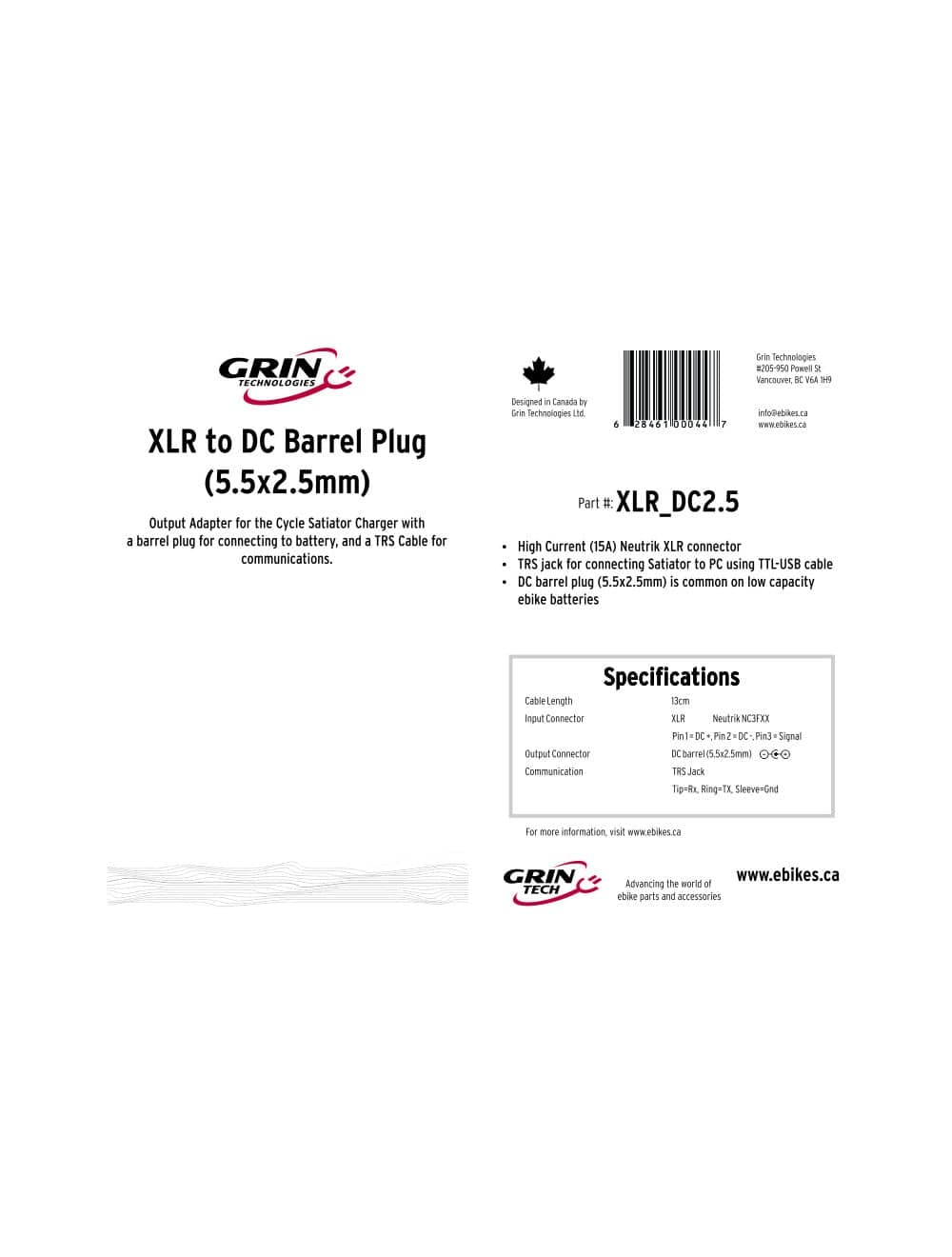 Der XLR zu DC2.5 Adapter wandelt den XLR-Stecker auf den in schwächeren Akkus gängigem DC2.5 Hohlstecker. Der XLR Stecker ist für Grin Komponenten typischer Anschluss, da er hohe Stromstärken bis 15A aushält. Er wird beispielsweise im Universalladegerät, im Phaserunner Controller oder in den Grin PAS-Sensoren verwendet. Dieser Adapter verfügt außerdem über eine TRS-Buchse, um das Universalladegerät mit dem TTL-USB Programmierkabel verbinden zu können.