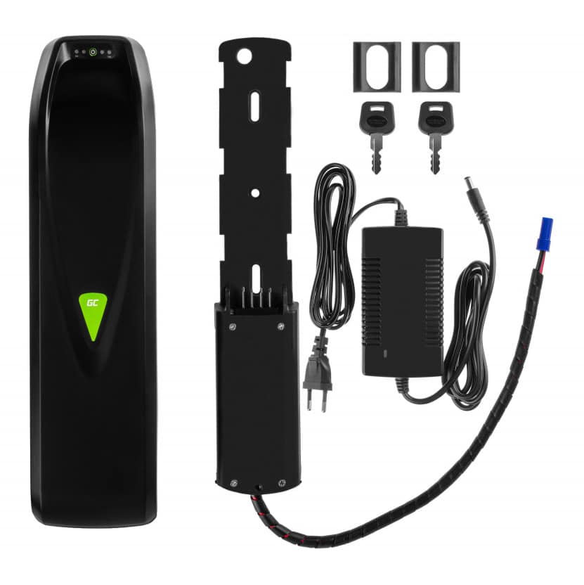 Der Akku stellt die Energie für Ihr E-Bike System zu Verfügung. Für ein optimales E-Bike Erlebnis empfehlen wir die Verwendung von hochwertigen Akkus. Diese Batterie von GreenCell erfüllt alle Anforderungen und ist perfekt mit unseren Systemen sowie nahezu jedem anderen E-Bike System kompatibel. Der qualitativ hochwertige Akku verwendet ausschließlich GreenCell Zellen und ist für Systeme bis 250W Motorleistung ausgelegt. Zudem wird hier ein Battery-Managegement-System (BMS) verwendet, was sowohl ein Überladung als auch eine Tiefenentladung verhindert. Außerdem sorgt das BMS für eine lange Lebensdauer, so dass Sie möglichst viel von Ihrem Akku haben. An der Batterie selbst können Sie die aktuelle Ladung über eine LED-Anzeige ablesen. Auch ein Anti-Diebstahl-Schloss ist mit verbaut. Dank der Befestigungsschiene ist eine einfache und schnelle Entnahme vom Fahrrad auch jederzeit möglich, sollten Sie den Akku beispielsweise getrennt vom Rad laden wollen. Sie können den Akku über einen EC5-Stecker mit Ihrem E-Bike System verbinden. Auch eine Konversion zu anderen Steckern wie Anderson-Powerpole oder XT-Stecker ist mithilfe eines Adapters problemlos möglich.