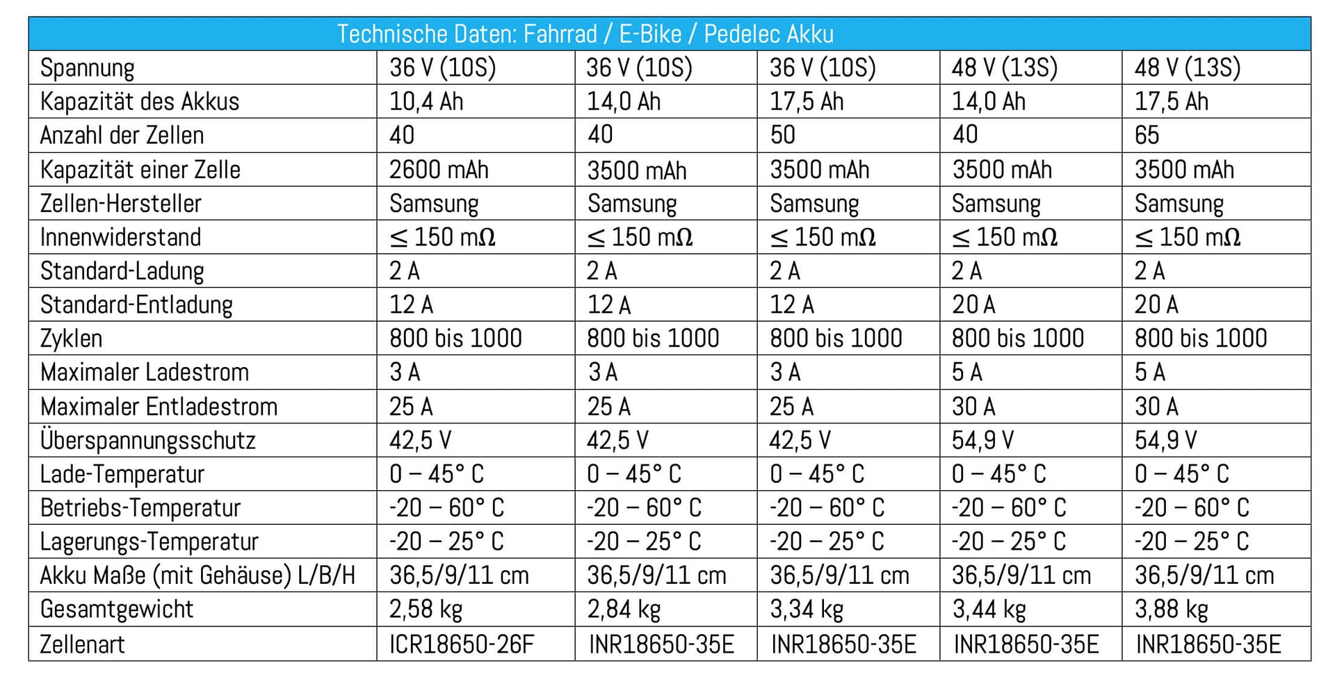 Abhängig von der gewählten Volt- und Zellenzahl ergeben sich verschiedene Konfigurationen mit unterschiedlichen technischen Daten: