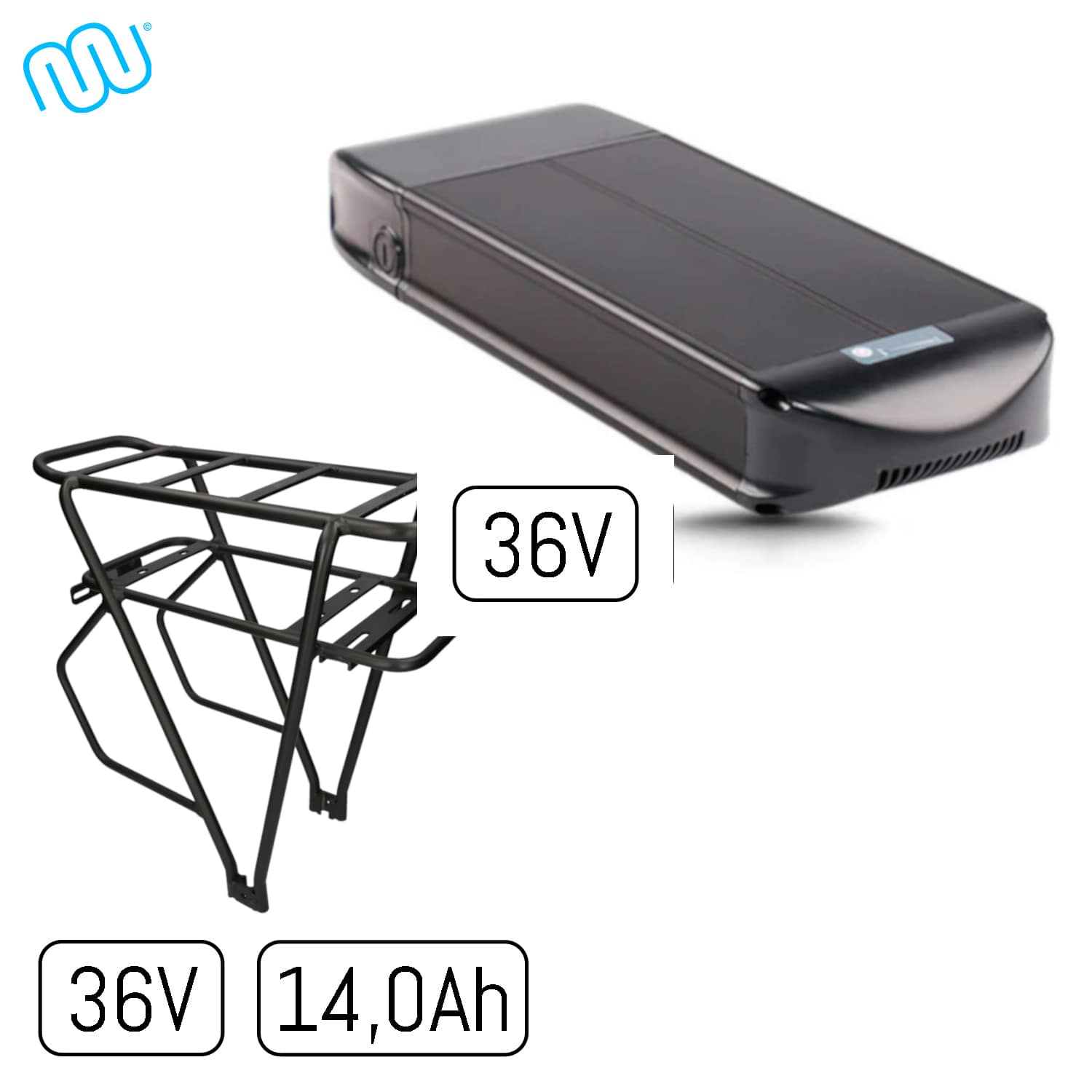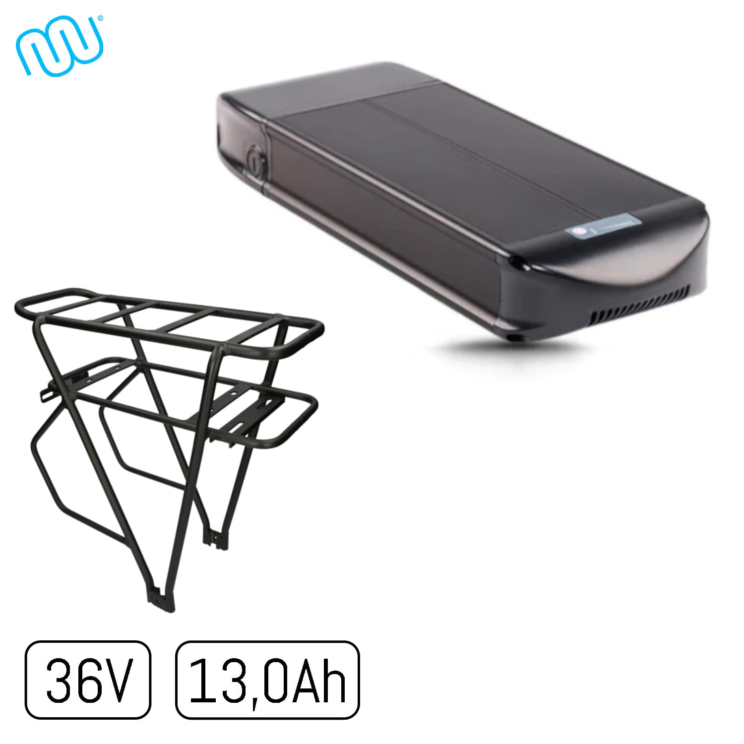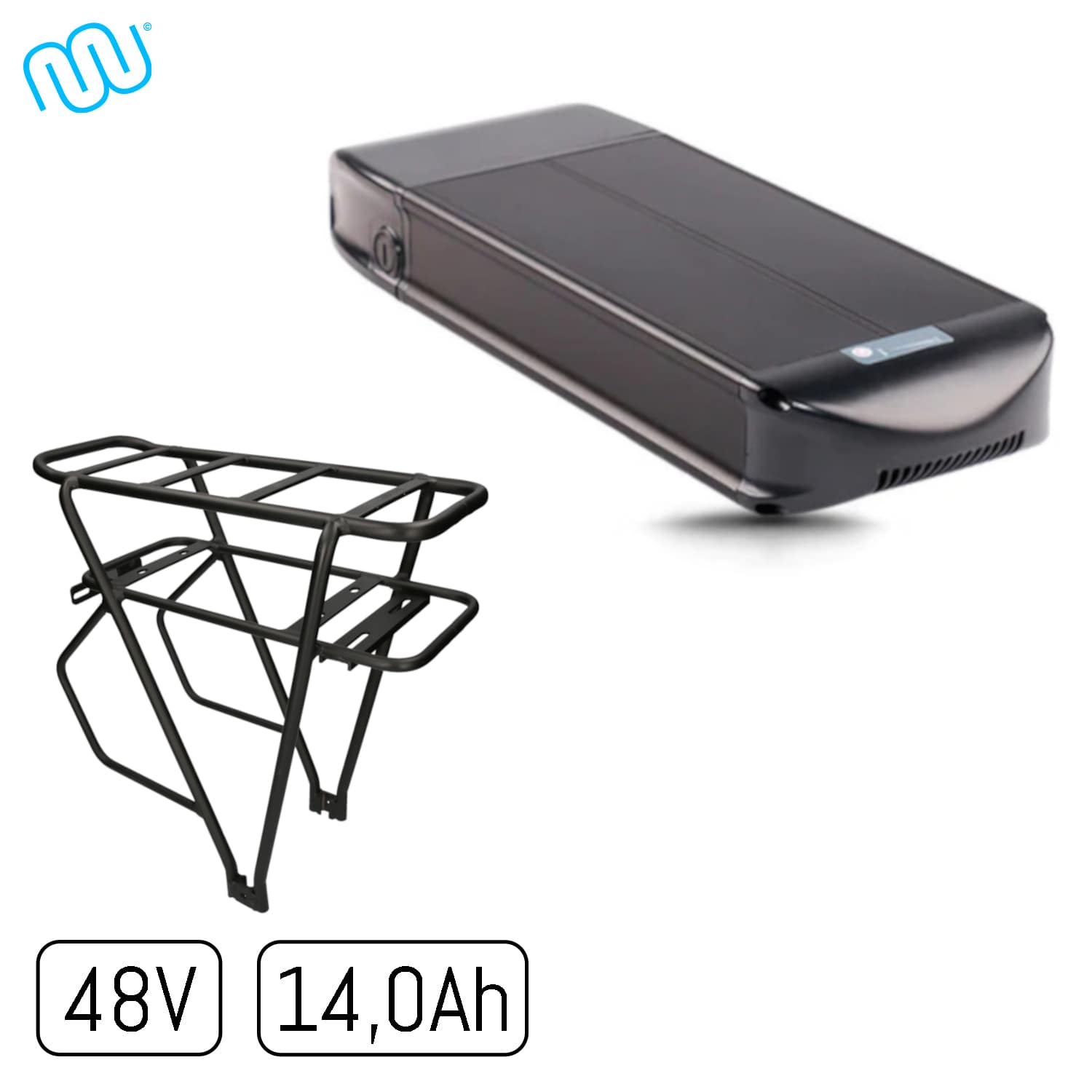 Sie können bei diesem Angebot wählen, ob Sie einen passenden Gepäckträger mit integrierter Halterung für den Akku zu Ihrer Bestellung hinzufügen wollen. Dieser garantiert eine perfekte Montage, zusätzlich können Sie den Gepäckträger wie üblich nutzen. Er besteht aus robustem Stahl und hat eine wetterbeständige schwarze Lackierung. Die 4 Befestigungspunkte des Gepäckträgers sind anpassbar und somit für die meisten Fahrräder geeignet.