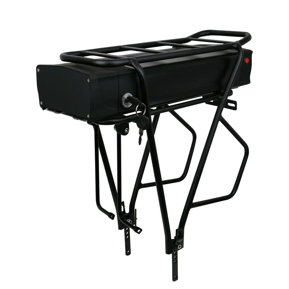 Sie können bei diesem Angebot wählen, ob Sie einen passenden Gepäckträger mit integrierter Halterung für den Akku zu Ihrer Bestellung hinzufügen wollen. Dieser garantiert eine perfekte Montage, zusätzlich können Sie den Gepäckträger wie üblich nutzen. Er besteht aus robustem Stahl und hat eine wetterbeständige schwarze Lackierung. Die 4 Befestigungspunkte des Gepäckträgers sind anpassbar und somit für die meisten Fahrräder geeignet.