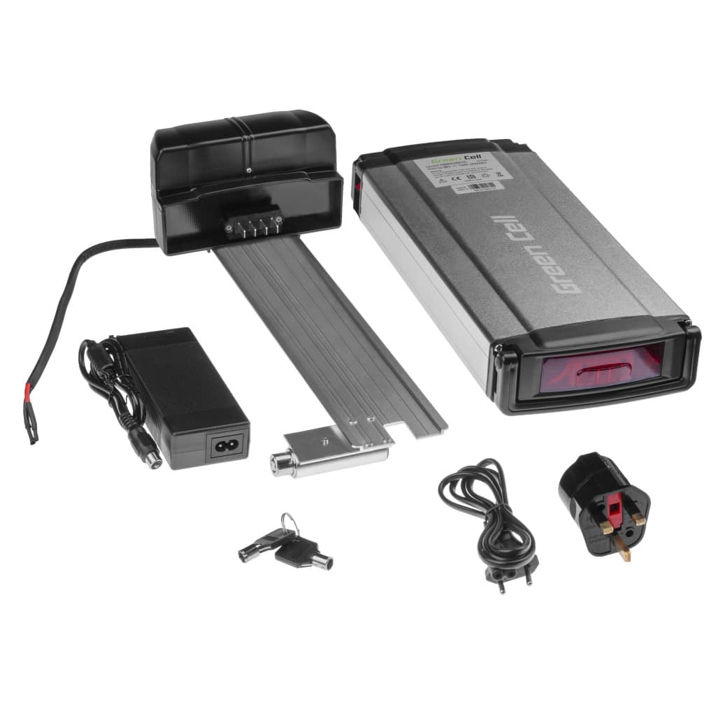 Der Akku stellt die Energie für Ihr E-Bike System zu Verfügung. Für ein optimales E-Bike Erlebnis empfehlen wir die Verwendung von hochwertigen Akkus. Diese Batterie von GreenCell erfüllt alle Anforderungen und ist perfekt mit unseren Systemen sowie nahezu jedem anderen E-Bike System kompatibel. Der qualitativ hochwertige Akku verwendet ausschließlich GreenCell Zellen und ist für Systeme bis 250W Motorleistung ausgelegt. Zudem wird hier ein Battery-Managegement-System (BMS) verwendet, was sowohl ein Überladung als auch eine Tiefenentladung verhindert. Außerdem sorgt das BMS für eine lange Lebensdauer, so dass Sie möglichst viel von Ihrem Akku haben. An der Batterie selbst können Sie die aktuelle Ladung über eine LED-Anzeige ablesen. Auch ein Anti-Diebstahl-Schloss ist mit verbaut. Dank der Befestigungsschiene ist eine einfache und schnelle Entnahme vom Fahrrad auch jederzeit möglich, sollten Sie den Akku beispielsweise getrennt vom Rad laden wollen. Dank der Befestigungsschiene ist eine einfache und schnelle Entnahme vom Fahrrad auch jederzeit möglich, sollten Sie den Akku beispielsweise getrennt vom Rad laden wollen. Sie können den Akku über einen 4Pin-Stecker mit Ihrem E-Bike System verbinden.