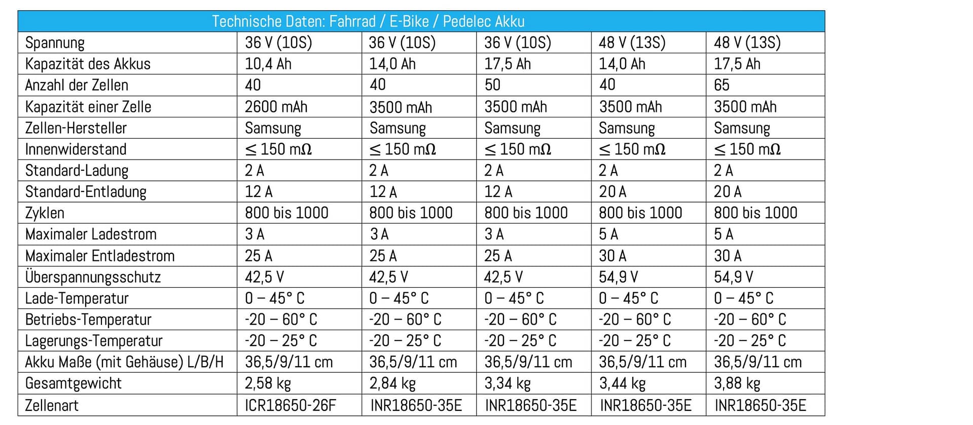 Premium Samsung-Zellen in allen Akkus (ICR18650-26F für 10,4Ah und INR18650-35E für 17,5Ah und 14Ah)
