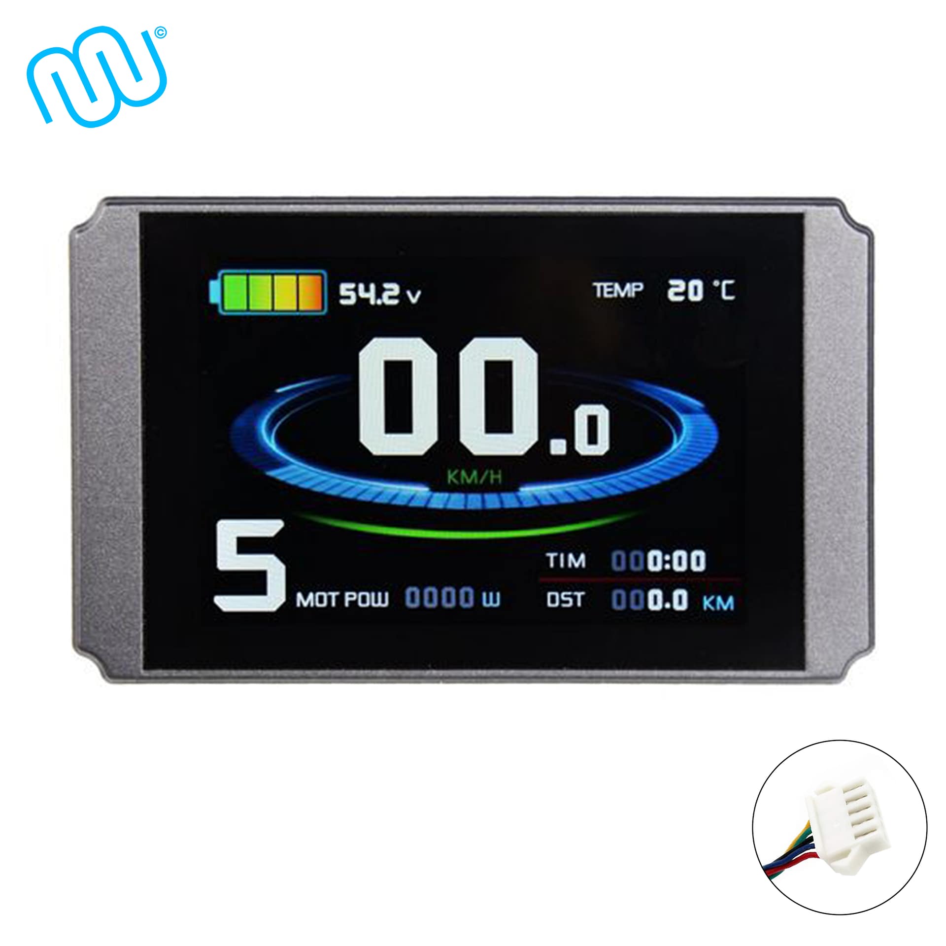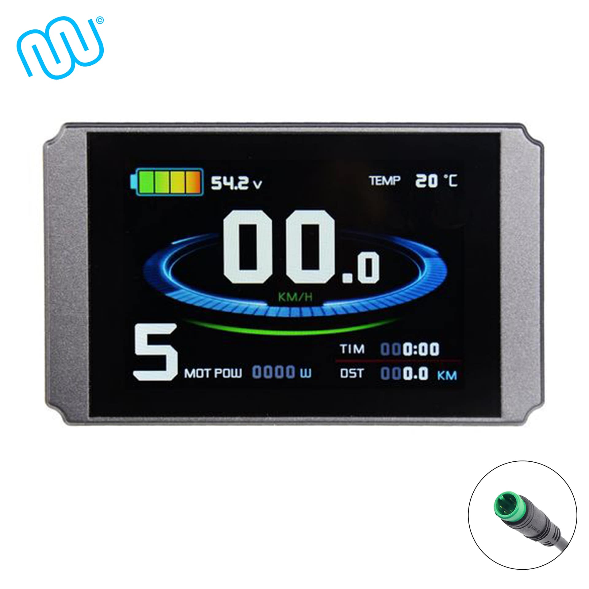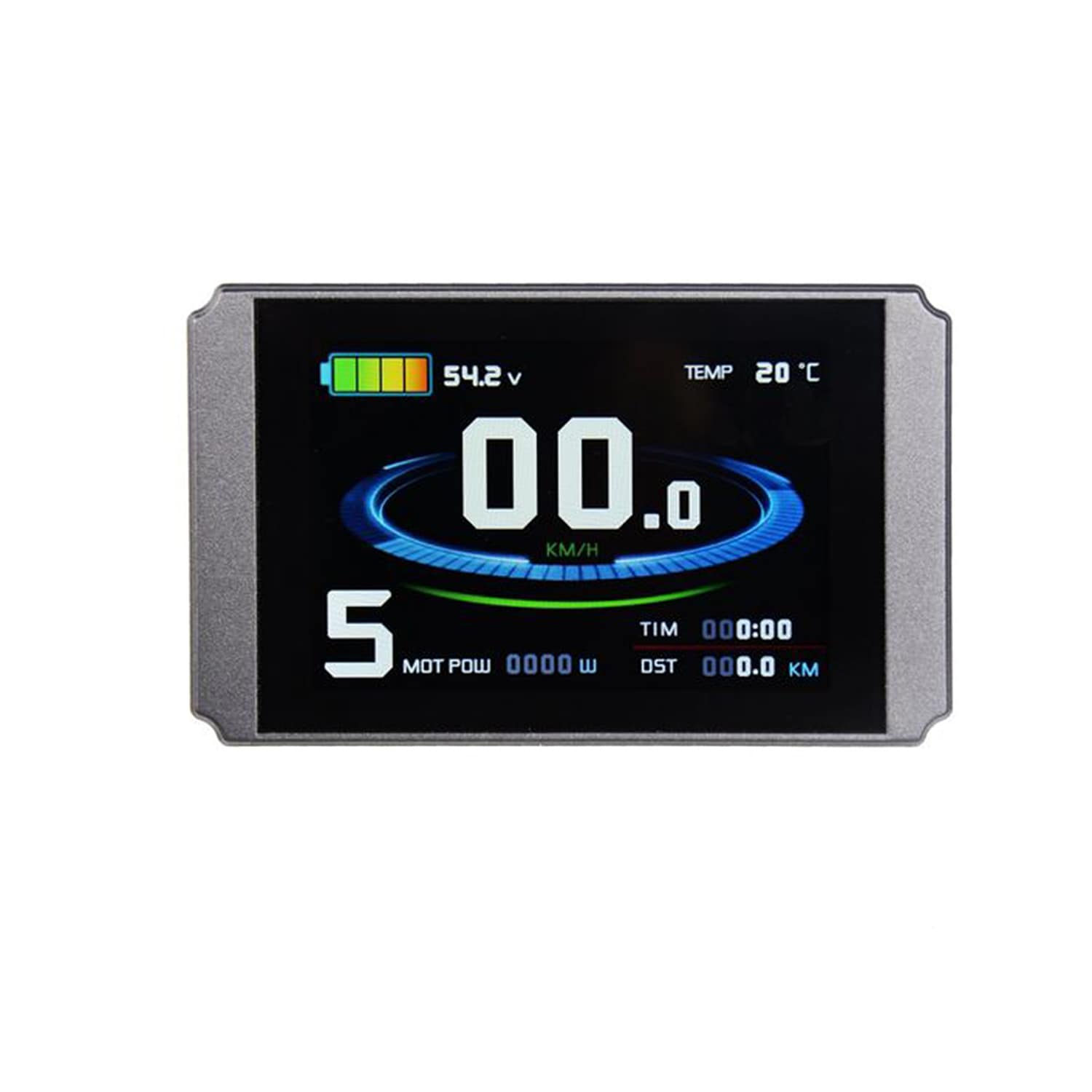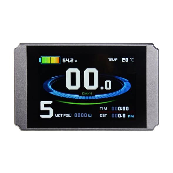 Das KT-LCD8H Display wird über den jeweiligen Stecker mit dem Controller verbunden. Der Bordcomputer bietet 5 einstellbare Unterstützungsstufen sowie eine Geschwindigkeitsanzeige (momentane, durchschnittliche und maximale Geschwindigkeit). Zudem können über das Bedienelement des Displays die Lichter Ihres E-Bikes gesteuert werden. Die Akkuladung wird Ihnen über 4 Balken angezeigt, aber auch eine genaue Anzeige der aktuellen Voltzahl ist möglich. Weitere Funktionen sind: Kilometerzähler, Fehlercode-Anzeige, Passwortschutz, Fahrtdaueranzeige, Auto Aus und Anfahrhilfe bis 6km/h. Das Display passt auf Lenker mit 31,8mm oder mit den gelieferten Reduzierstücken auf 22,2mm, das Steuerelement hat einen Durchmesser von 22,2mm.