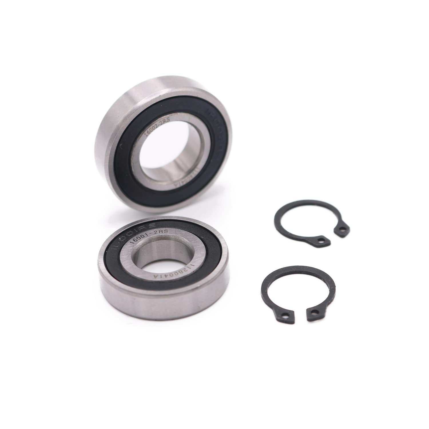 Lager 16001RS: Außendurchmesser 28 mm, Innendurchmesser 12 mm, Höhe 7 mm; inklusive zwei Sicherungsringe mit 14 mm Durchmesser. |