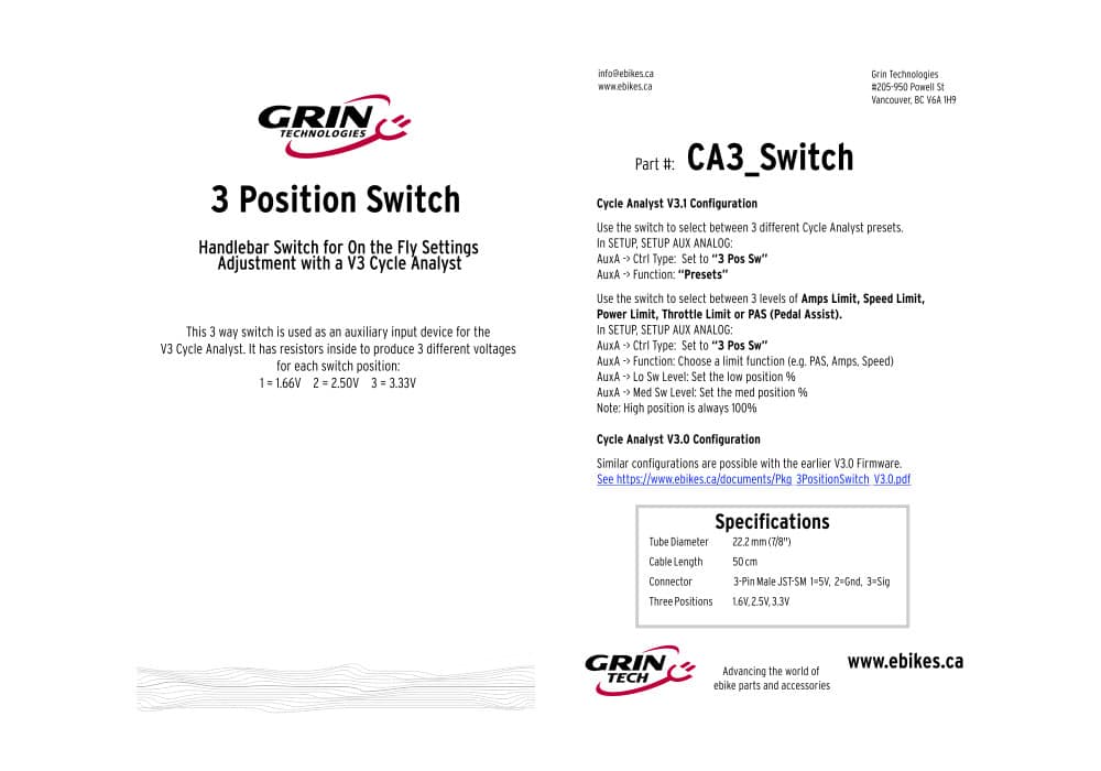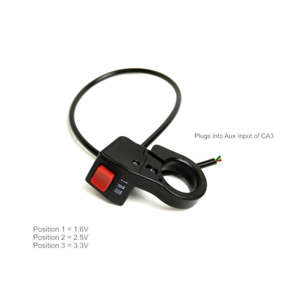 Der CA3-3-Weg-Schalter ist ein multifunktionaler Taster für den Cycle Analysten CA3-DPS von Grin Technologies. Dieser Schalter ermöglicht es dem Benutzer zwischen verschieden Modi direkt umzuschalten oder verschiedene Limits für einen Paramaeter per Knopfdruck auszuwählen. Der Schalter erzeugt durch verschiedene Spannungslevel die zugeordnete Funktion (1,66V; 2,5V; 3,33V). Welche der beiden Funktionen Sie benutzen wollen, können Sie im Cyce Analysten einstellen, mehr Informationen finden Sie dazu in der beigelegten Anleitung. Der Schalter ist dank klappbaren Klemmen einfach zu installieren ohne Griffe und sonstiges Zubehör abmontieren zu müssen. Er ist mit einem robusten und langlebigen Kunststoffgehäuse ausgestattet, das für den Einsatz unter verschiedenen Wetterbedingungen geeignet ist. Er bietet eine zuverlässige und präzise Steuerung des Cycle Analyst-Displays während der Fahrt und bietet eine bequeme und intuitive Steuerung für eine optimale E-Bike-Leistung und -Effizienz.