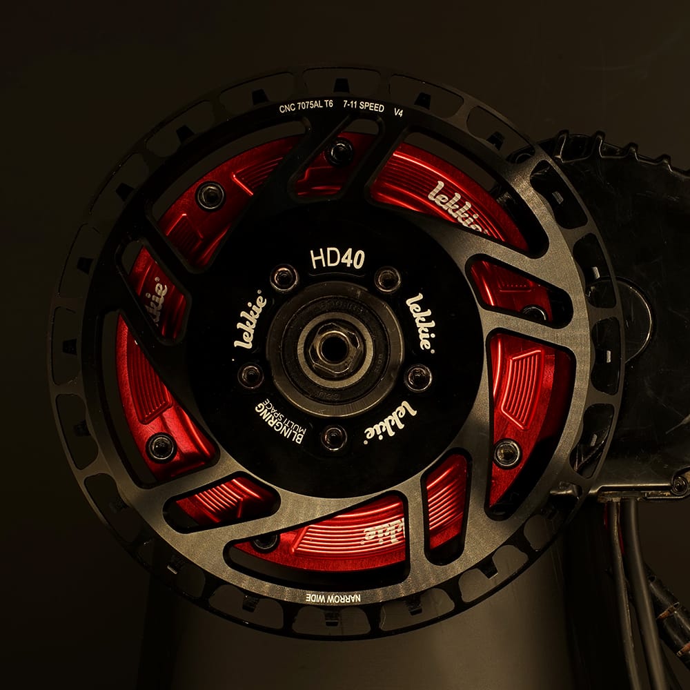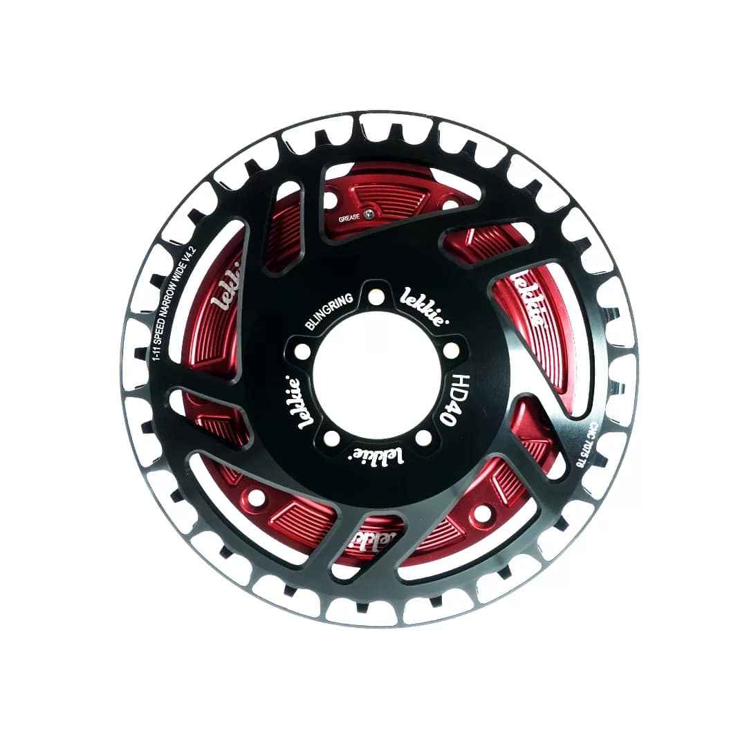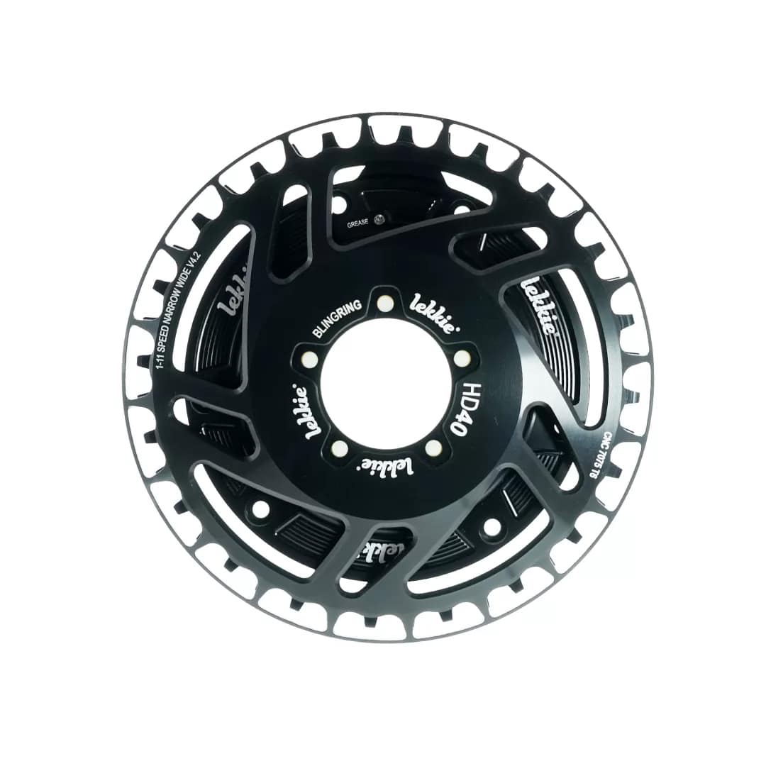 Das Lekkie Bling Ring 40T Kettenrad mit 40 Zähnen, dem Bling Ring Spacer und dem Drive Cover ist nun das kleinste Kettenblatt, welches den richtigen Versatz und die Kettenlinie beibehält. Die Motorabdeckung schützt den Motor zusätzlich vor Schmutz und Wasser. Das Bling Ring Kettenblatt 40T hat 2mm mehr Versatz als das 42T Kettenblatt. Den Bling Ring Spacer können Sie zusätzlich verwenden, wenn Sie einen Standardversatz von 18,3mm benötigen. Der Offset lässt sich von 16,3mm bis 20,3mm variieren. Das ca. 150 Gramm schwere Kettenblatt ist aus einem Block Aluminium gefräst. Durch die wärmebehandelte Legierung 7075 wird das Gewicht, bei gleichzeitiger Beibehaltung der Zahnhärte, reduziert. Ausgelegt ist das Kettenblatt für 7, 8, 9, 10, 11-fach Ketten bei den meisten Herstellern, bei dem SRAM Eagle empfiehlt sich hier eine 12-fach Kette. Es passt jedoch nicht zum Shimano 12-speed KMC X101 und KMC Z1eHX. Kompatibel ist das Kettenblatt lediglich zum Bafang BBSHD Motor.