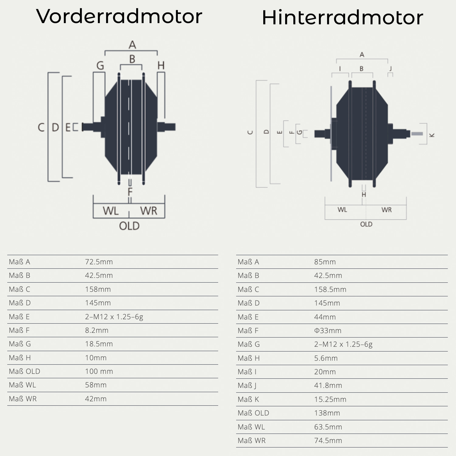 | 250W – Vorderrad | 250W – Hinterrad | 500W – Vorderrad | 500W – Hinterrad | |