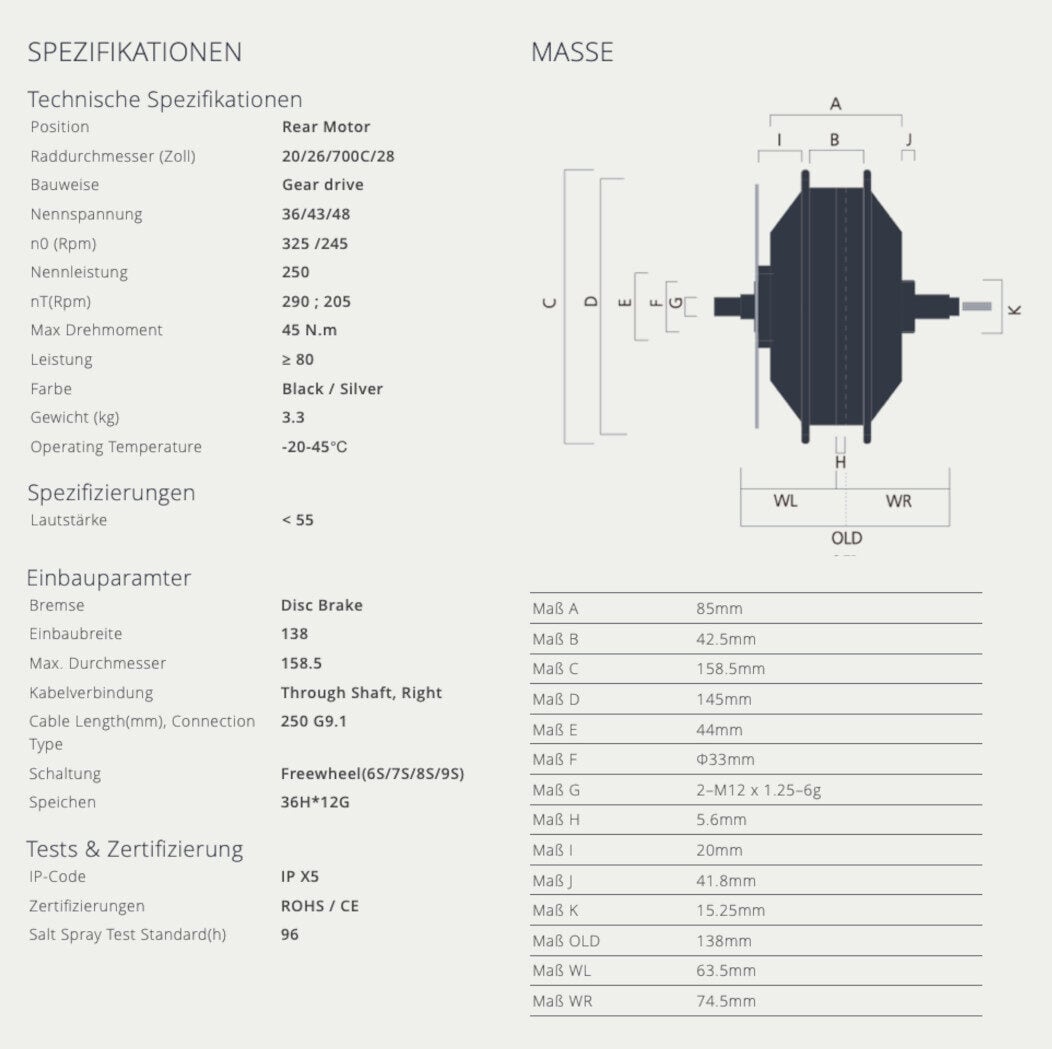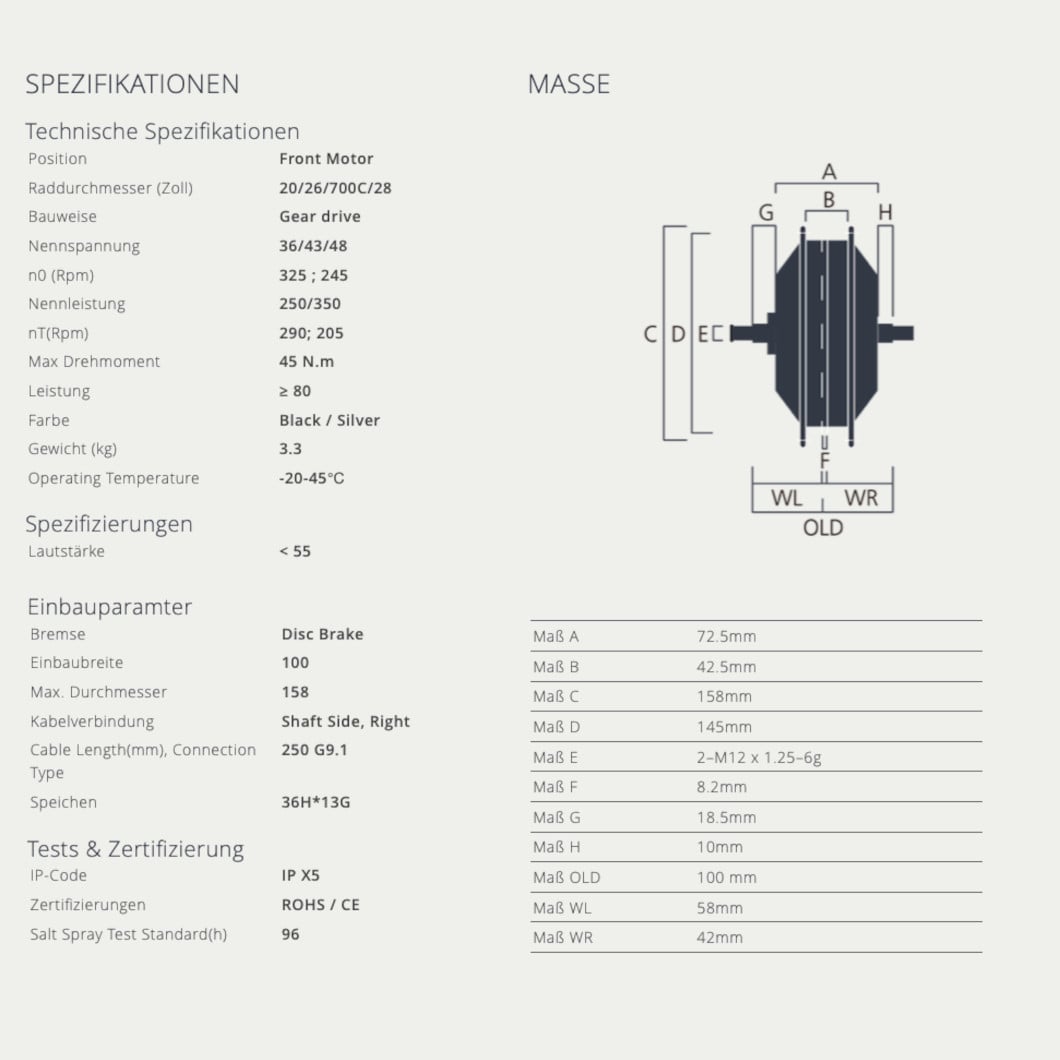 | Spannung - Leistung | 36V – 250W, 36V – 350W, 48V – 500W |