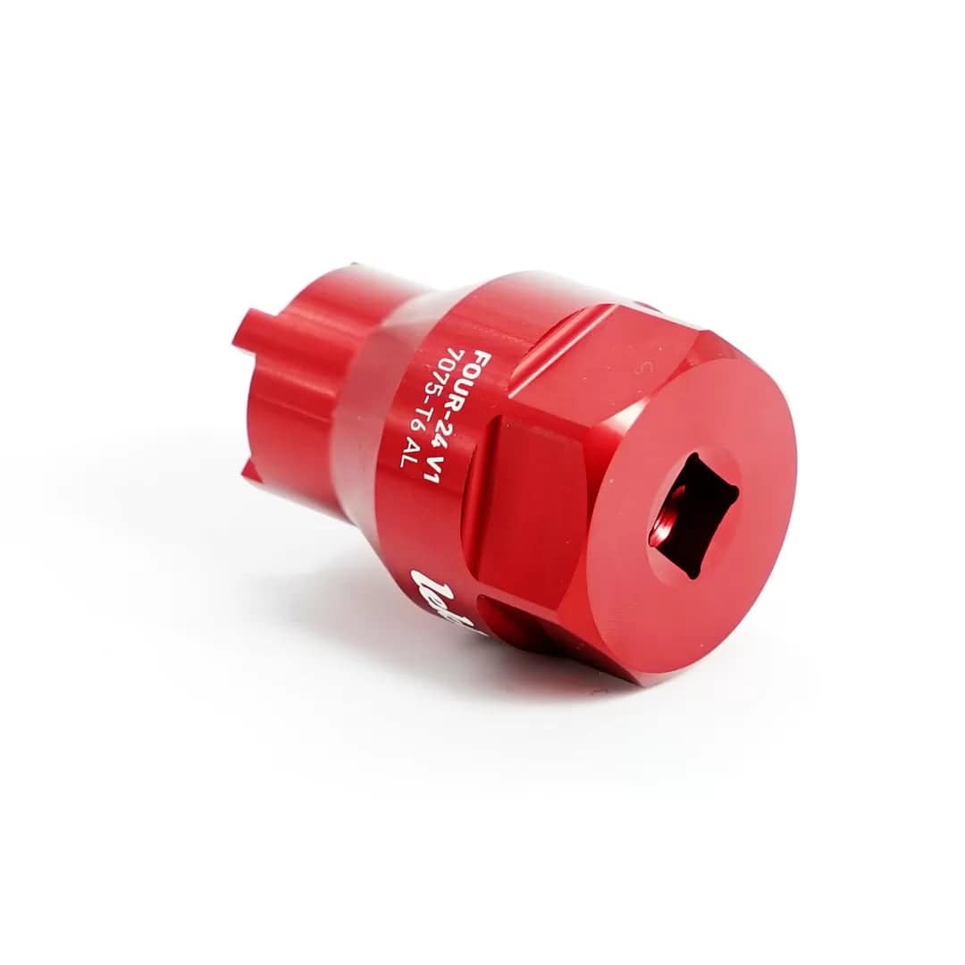 Die Four-24 Nuss V1 besteht aus besonders widerstandsfähigem geschmiedetem 7075 Aluminium, welches mit CNC ausgefräst wurde. Es wurde T6 hitzebehandelt und dann rot eloxiert. Dieser aufwendige Herstellungsprozess sorgt für ein hochwertiges und langlebiges Werkzeug.
