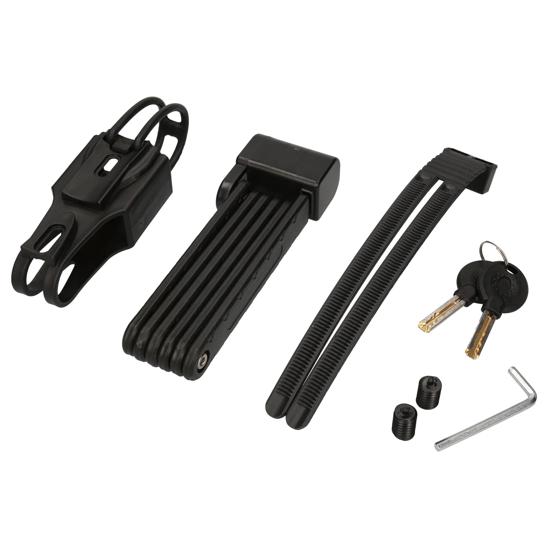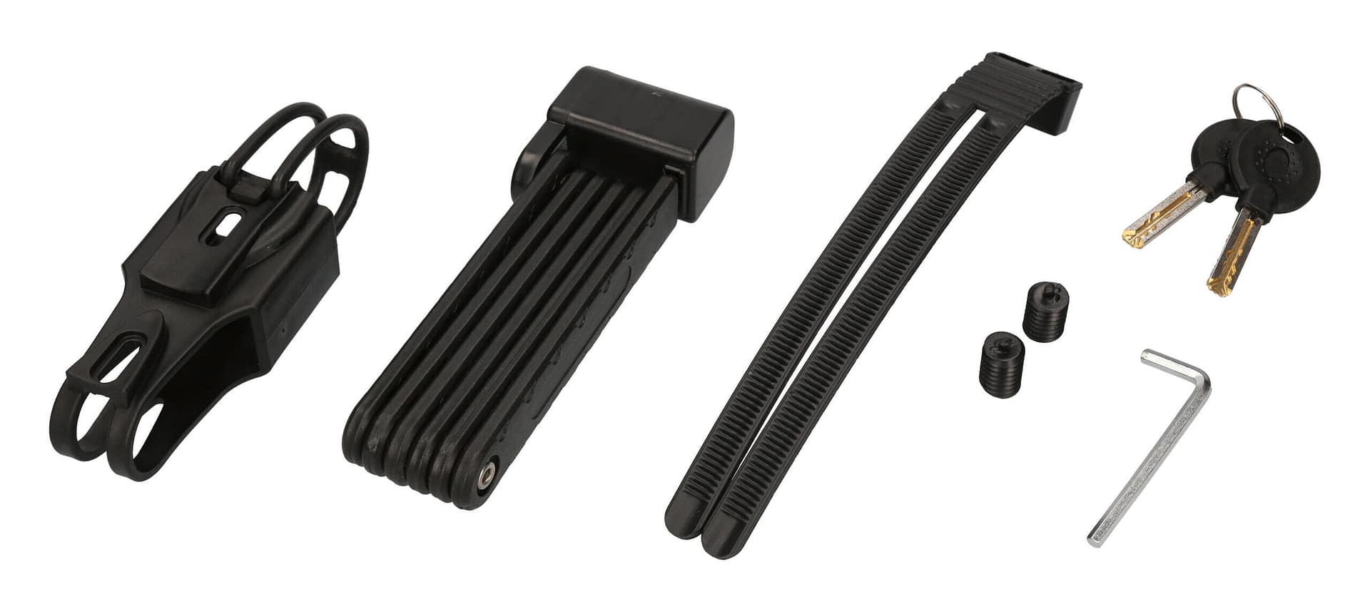 Dieses Faltschloss aus massivem Stahl eignet sich perfekt, um Ihr Fahrrad, Pedelec oder E-Bike zuverlässig vor Diebstahl zu schützen. Mit seinen insgesamt 700g Gewicht ist das Schloss nicht zu schwer für den Transport, schreckt aber Diebe mit seiner massiven Bauart ab. Zudem erhalten Sie auch eine Halterung für den Fahrradrahmen, so dass Sie immer einen festen Ort zum Verstauen des Schlosses am Fahrrad haben. Diese Halterung ist so gebaut, dass Sie bzw. das Schloss auch bei unebenen Wegen nicht klappert. Das Schloss ist in Schwarz, Rot oder Blau verfügbar.