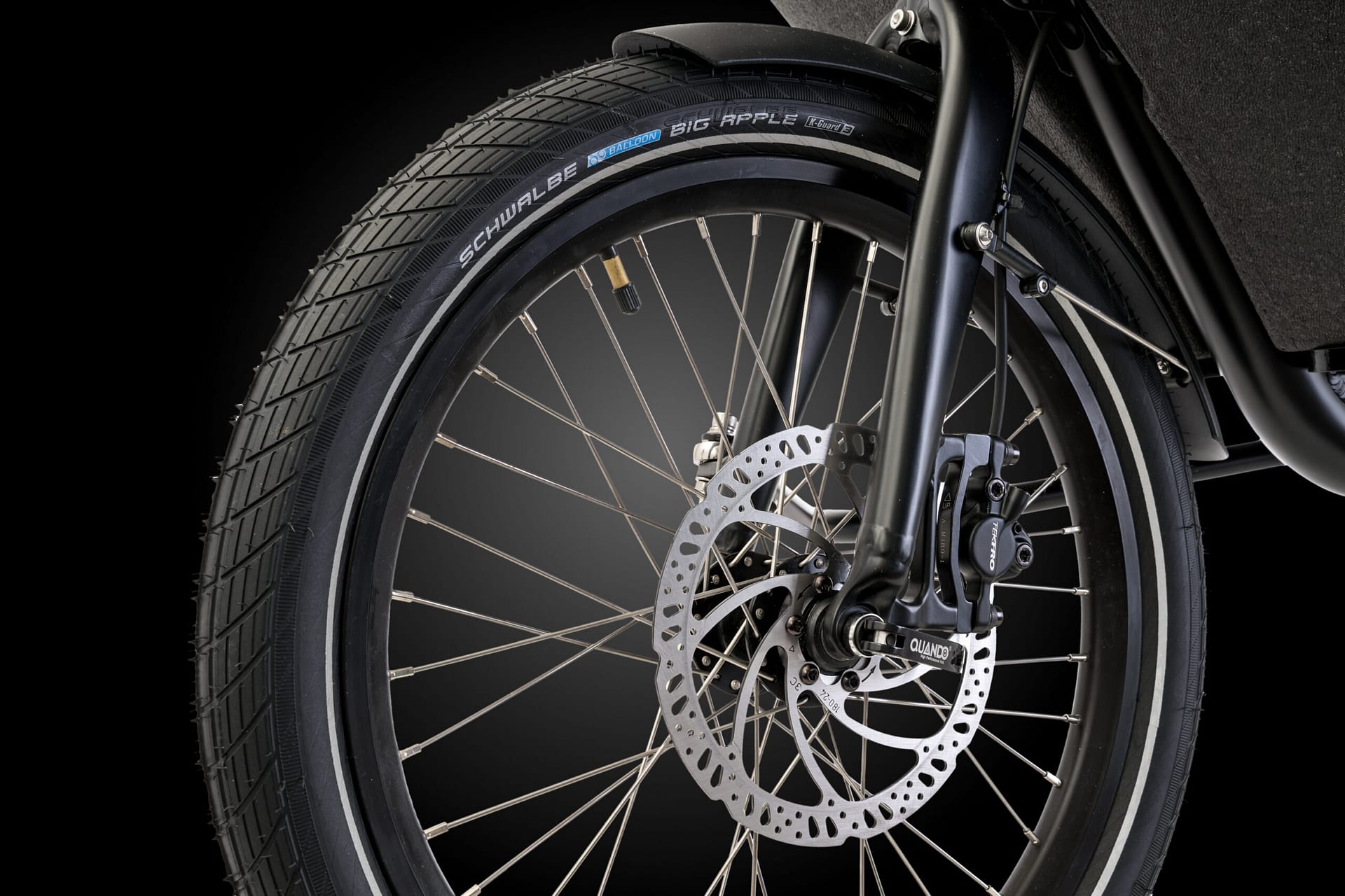 Für Ihre Sicherheit sorgen hydraulische Scheibenbremsen der Marke TEKTRO mit 180 mm großen Bremsscheiben, ein 30 Lux starkes Vorderlicht und ein helles Rücklicht. Reflektoren an den Pedalen und am Verdeck erhöhen die Sichtbarkeit im Straßenverkehr. Die unplattbaren Schwalbe Big Apple Reifen und der gefederte, ergonomische Sattel gewährleisten zusätzlichen Fahrkomfort.