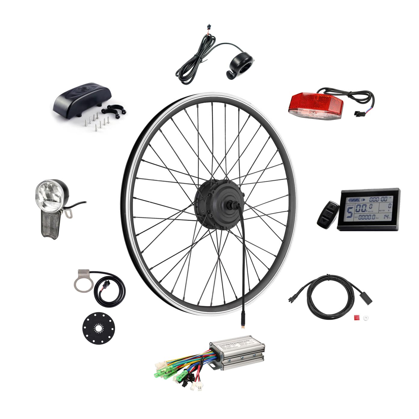 windmeile | E-Bike Umbausatz, Nabenmotor Vorderrad, Schwarz, Professional, 20“/26“/28“, 36V/48V, 250W, Controller, Daumengas, Display, Lichter, Bremssensor, Pedalsensor, Controller-Box, E-Bike, Pedelec