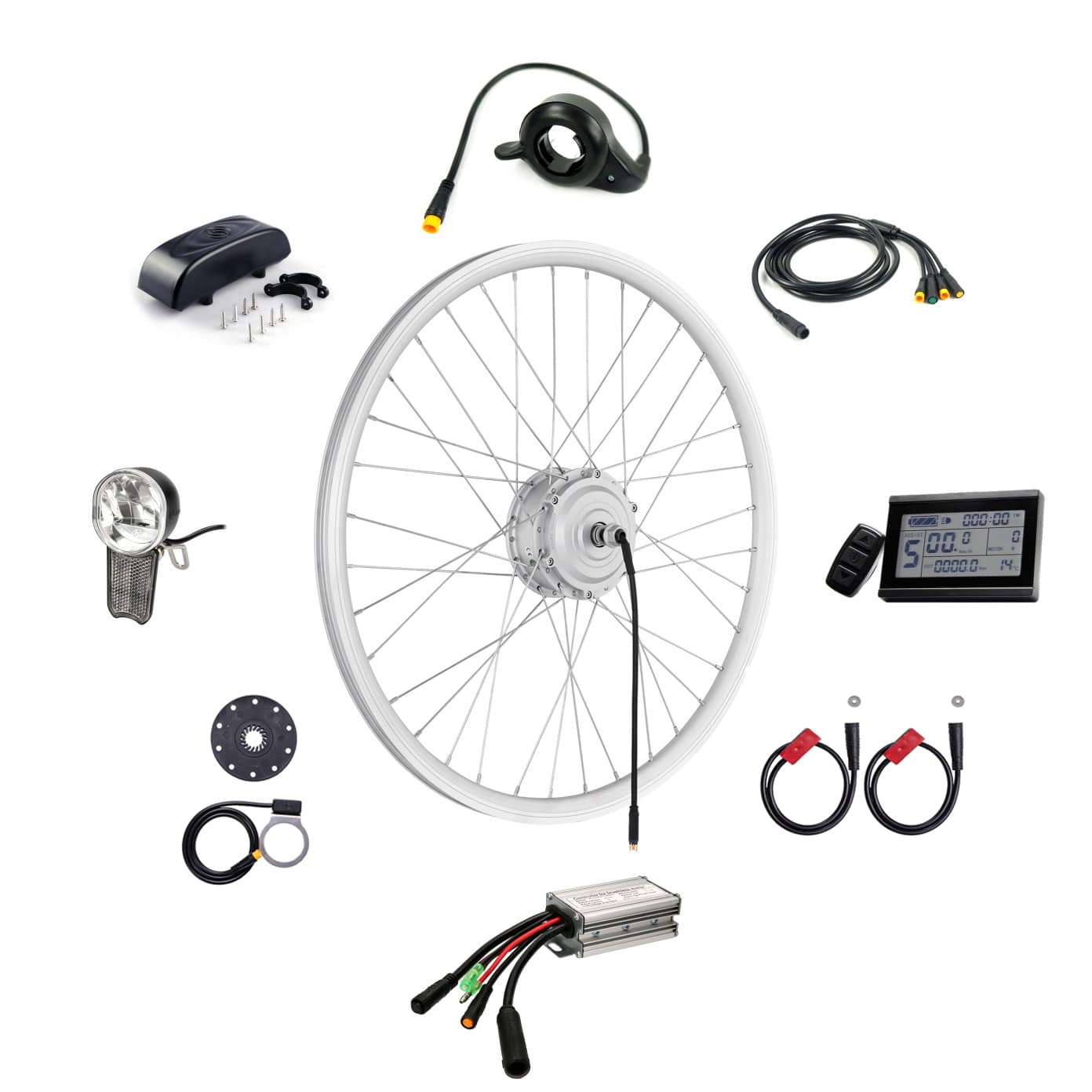 windmeile | E-Bike Umbausatz, Nabenmotor Vorderrad, Silber, Waterproof, 20“/26“/28“, 36V/48V, 250W, Controller, Daumengas, Display, Lichter, Bremssensor, Pedalsensor, Controller-Box, E-Bike, Pedelec