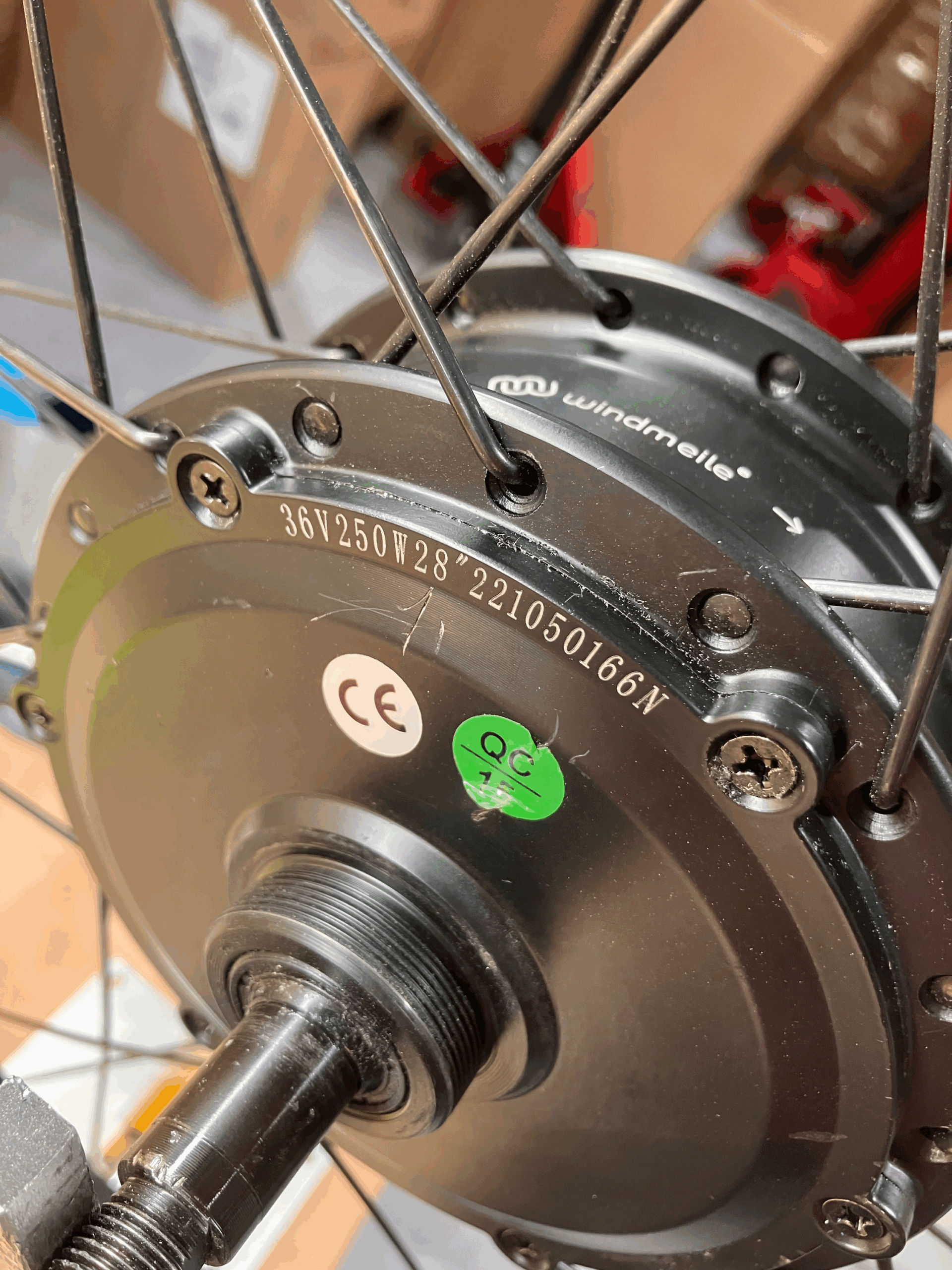 Schwarzer windmeile Hinterradmotor mit Schraubkranzaufnahme 36V 250W eingespeicht 28″